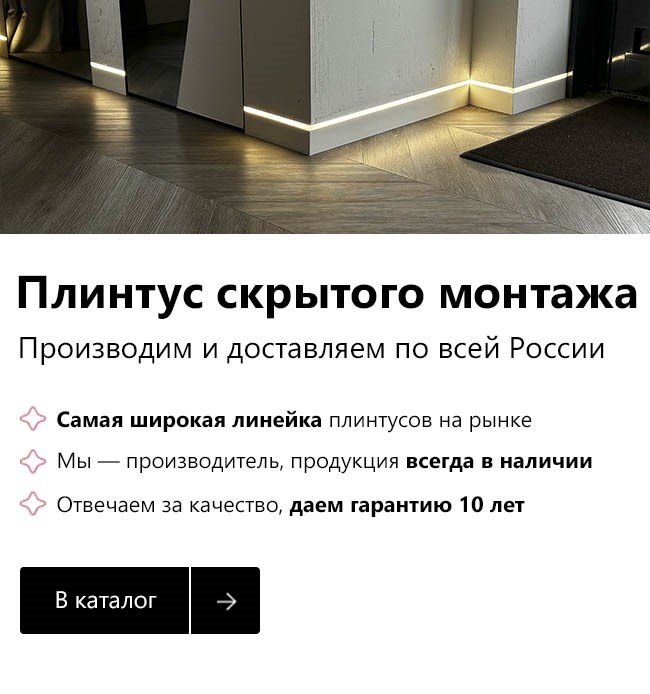 Компания Pro Design предлагает не только плинтуса скрытого монтажа, но и широкий выбор других изделий для оформления интерьера. В ассортименте представлены различные модели, которые отличаются по дизайну, цвету и размеру, что даёт возможность подобрать идеальный вариант для любого проекта. Кроме того, производство предусматривает возможность изготовления плинтусов по индивидуальным размерам и с дополнительными опциями для удобства клиентов.